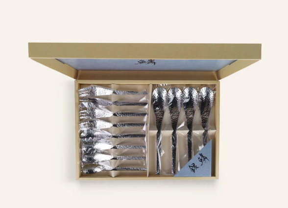 Cuillères à café (126x24mm 17g)x4, Cuillères à gâteau (130x19mm 15g)x4, Cuillères à dessert (171x31mm 29g)x4