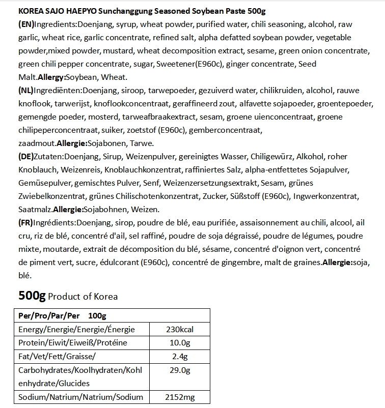 SAJO HAEPYO Sunchanggung Pâte de Soja Assaisonnée 500 g